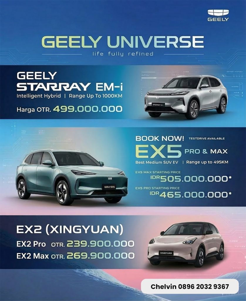 Selamat datang di Promo Geely Official! Kami bangga mempersembahkan inovasi otomotif terdepan dari Geely, produsen mobil global yang telah diakui kualitas dan teknologinya. Jelajahi berbagai pilihan mobil yang stylish, andal, dan dilengkapi fitur canggih, dirancang untuk memenuhi kebutuhan dan gaya hidup modern Anda. Bersama Geely, nikmati pengalaman berkendara yang lebih aman, nyaman, dan ramah lingkungan.