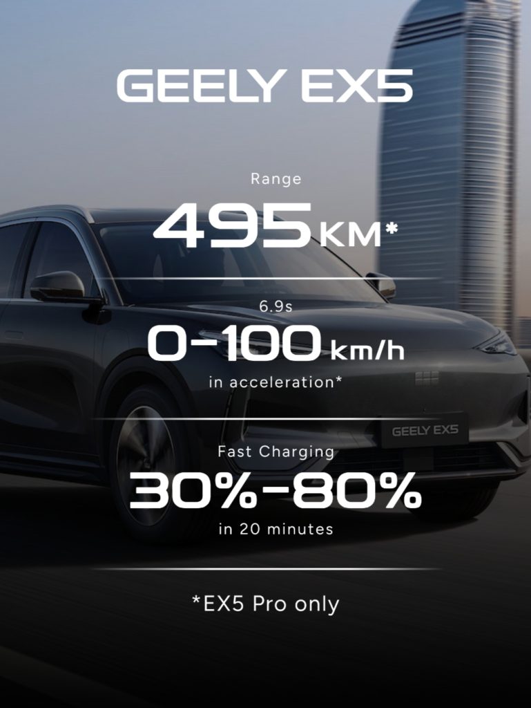Geely EX5 merupakan SUV listrik canggih yang menggabungkan performa superior, efisiensi energi, dan inovasi teknologi. Ditenagai motor listrik berkekuatan 160 kW (214 hp) dengan torsi 320 Nm, kendaraan ini mampu menempuh jarak hingga 495 km (NEDC) dalam sekali pengisian. Teknologi pengisian cepat memungkinkan daya terisi dari 30% hingga 80% hanya dalam 20 menit.